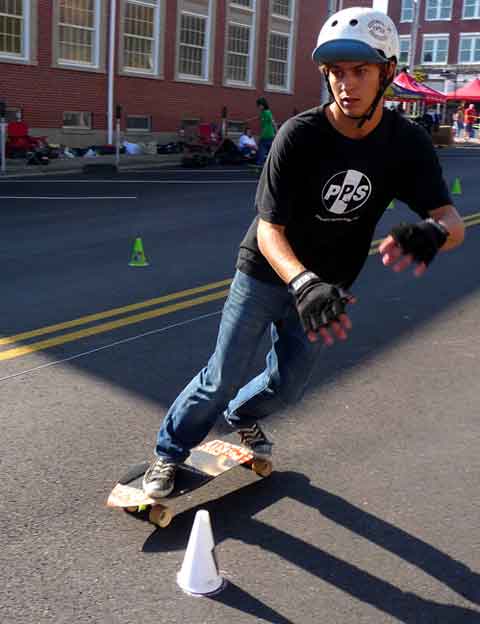 Because the Cone Fest is held in conjunction with a local festival called Poage Landing Days (the original name of Ashland was Poage Landing), hundreds of spectators stopped by to watch the racing at various points during the day. After qualifying, the 33 racers were divided into A, B and C groups, and each group was run down to the round of 4 before moving on to the next group. This allowed racers to race both heats without having to wait 45 minutes or more between runs, and then saved the fastest racing in each round for last. Spectators got to see bang-bang racing, one heat after another, with good announcing to explain what was going on--a big help for showing them how fun and exciting slalom skateboarding can be. Kudos to Lenny, Jenny, Stephanie, Marla and all the other race staff and volunteers for helping things to run so well.